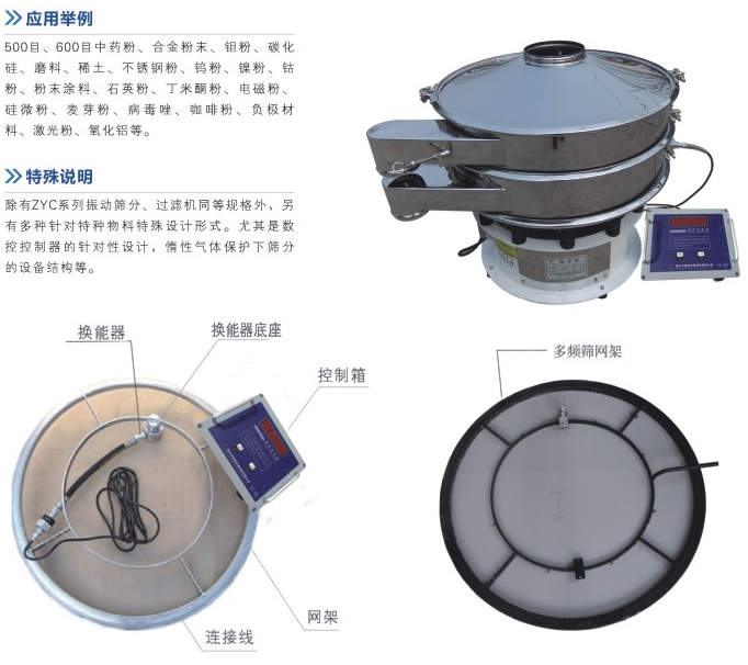超声波振动筛是本公司自主设计的智能超声控制器,改变了单一频率带来不适应性和不可调性,性能上超过同类产品的水平!